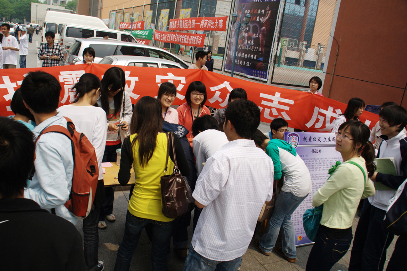 5月14日,我校校園里迅速發(fā)起的“抗震救災,眾志成城”為災區(qū)人民募捐的活動,得到了中醫(yī)學子的積極響應。同學們在踴躍捐款的同時,也留下了對災區(qū)人民的深情寄語,表達中醫(yī)學子對災區(qū)人民的拳拳之心。