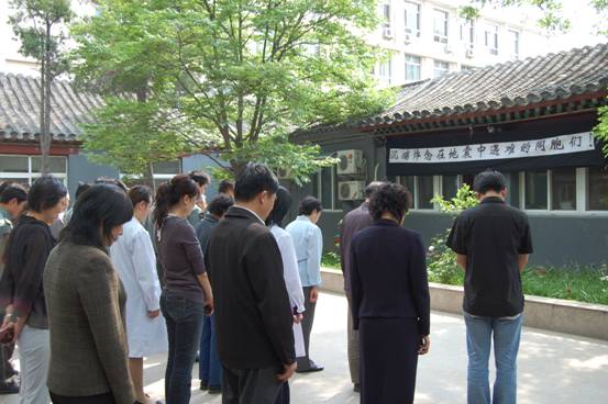 分,我校附屬醫院東直門醫院許多職工自發來到行政辦公區為在四川地震中遇難的同胞們默哀