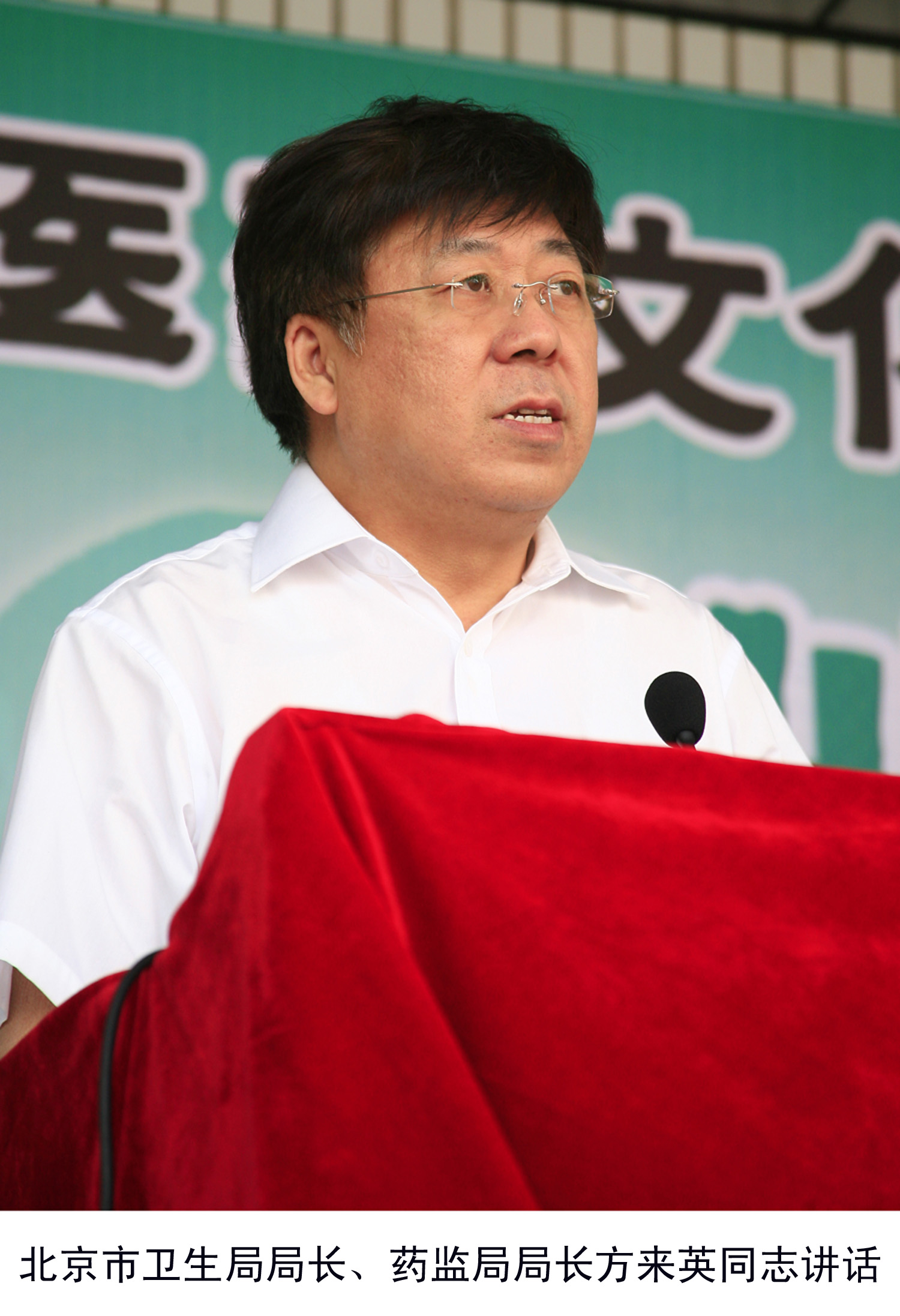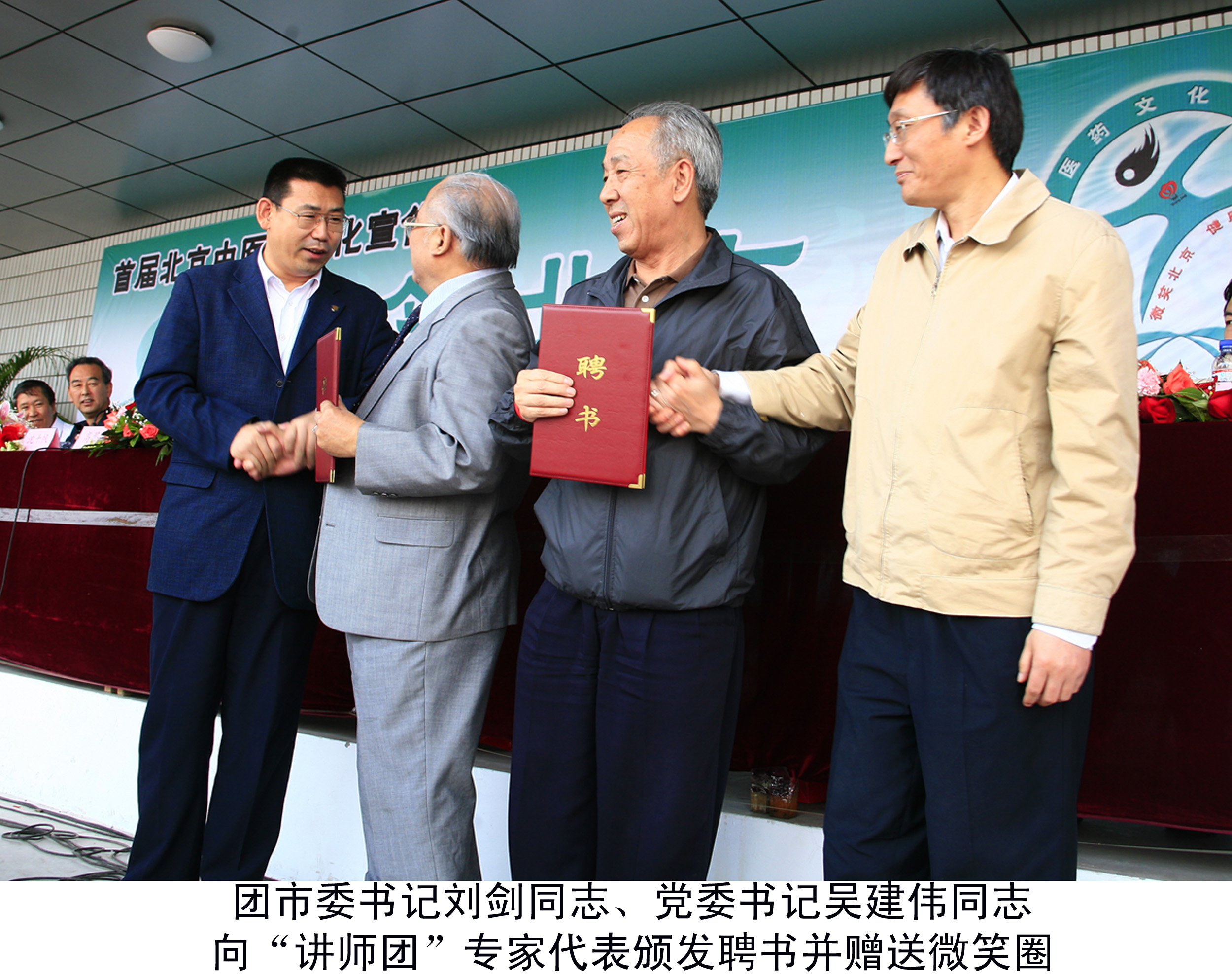 隨后,北京團市委書記劉劍同志、校黨委書記吳建偉同志向“講師團”專家代表頒發聘書并贈送微笑圈。北京市衛生局局長、藥監局局長方來英同志在講話中表示,舉辦“北京首屆中醫藥文化宣傳周活動”,目的在于通過“中醫藥文化進校區”、“中醫名科進社區”、“中醫名院進郊區”和“中醫養生日”等