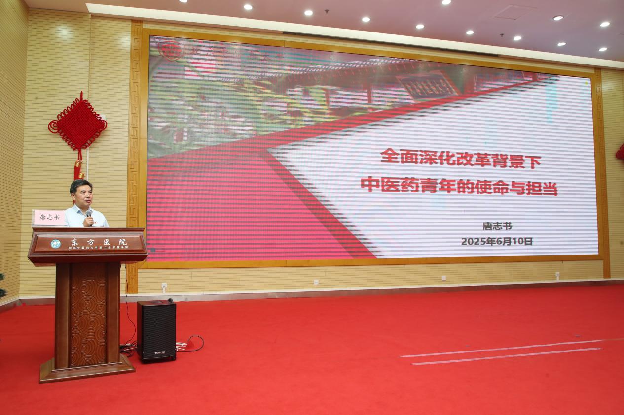 我校校長唐志書講黨課,寄語青年學子扛起中醫藥傳承創新時代使命6月10日上午,我校校長唐志書以“全面深化改革背景下中醫藥青年的使命與擔當”為題,為北京中醫藥大學第二臨床醫學院(東方醫院)學生黨支部帶來一堂立意深遠、催人奮進的專題黨課。東方醫院黨委書記韓振蘊,黨委副書記、院長商洪才及黨政領導班子成員,教育處教師、四個學生黨支部的黨員參加黨課學習。本次黨課由醫院黨委書記韓振蘊主持。112025-06