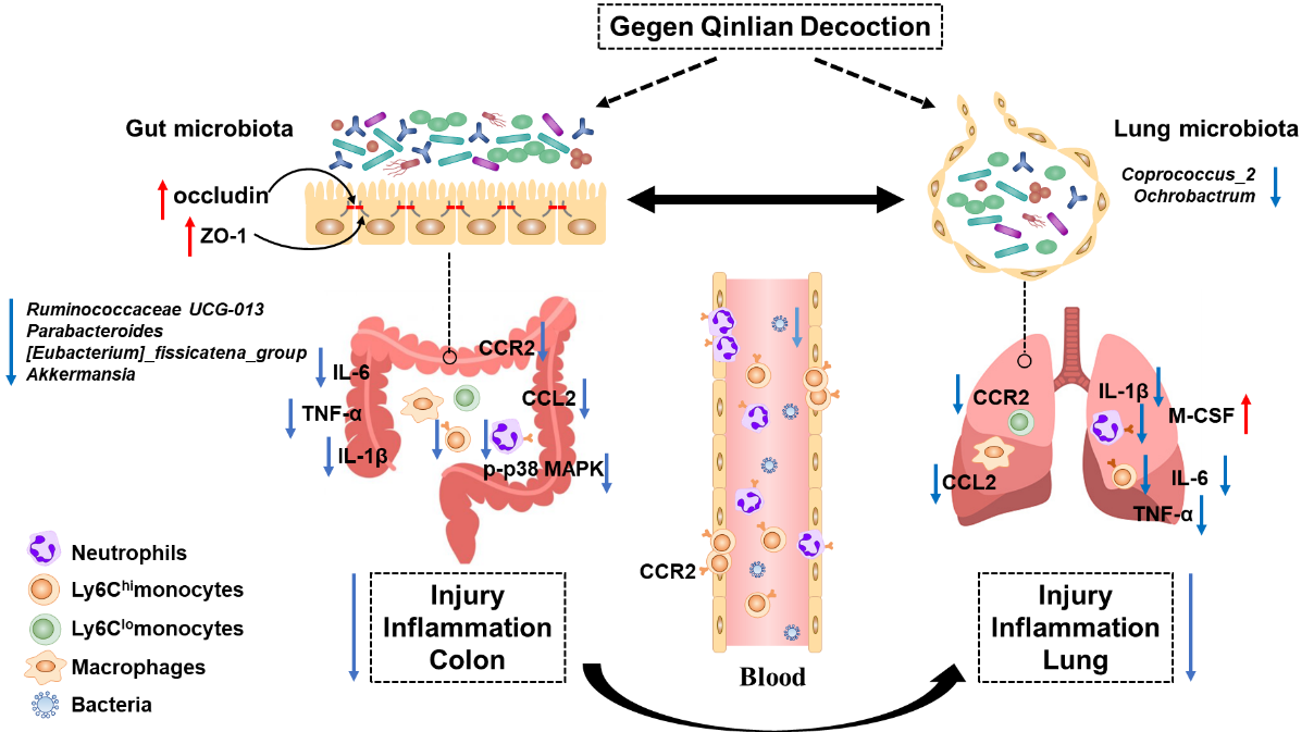 葛根芩連湯是治療UC或急性肺損傷的中醫經典方藥。課題組前期研究表明,該復方可通過上調UC小鼠結腸緊密連接蛋白表達以修復腸道黏膜屏障功能。本研究進一步發現葛根芩連湯能下調腸道和肺部炎性細胞因子(TNF-α、IL-1β、IL-6)的表達、抑制CCL2/CCR2趨化因子信號軸的激活,進而減少中性粒細胞和炎性單核細胞的募集,改善UC小鼠腸道和肺部損傷。同時,該復方可通過降低糞便中Ruminococcaceae UCG-013,Parabacteroides,[Eubacterium]_fissicatena_group和Akkermansia等的豐度,抑制肺部Coprococcus 2和Ochrobactrum的繁殖,恢復腸道和肺部微生態平衡。這些標志性細菌與髓性免疫細胞及其炎性細胞因子之間呈顯著相關。本研究認為葛根芩連湯抑制炎性髓系免疫細胞的招募和細胞因子過度分泌,重塑腸-肺軸之間的免疫與菌群穩態,從整體上緩解UC及其并發的肺損傷。該研究結果同時從中醫理論和臨床用藥實踐出發,為拓寬經方葛根芩連湯的臨床用藥范圍提供了理論支撐。