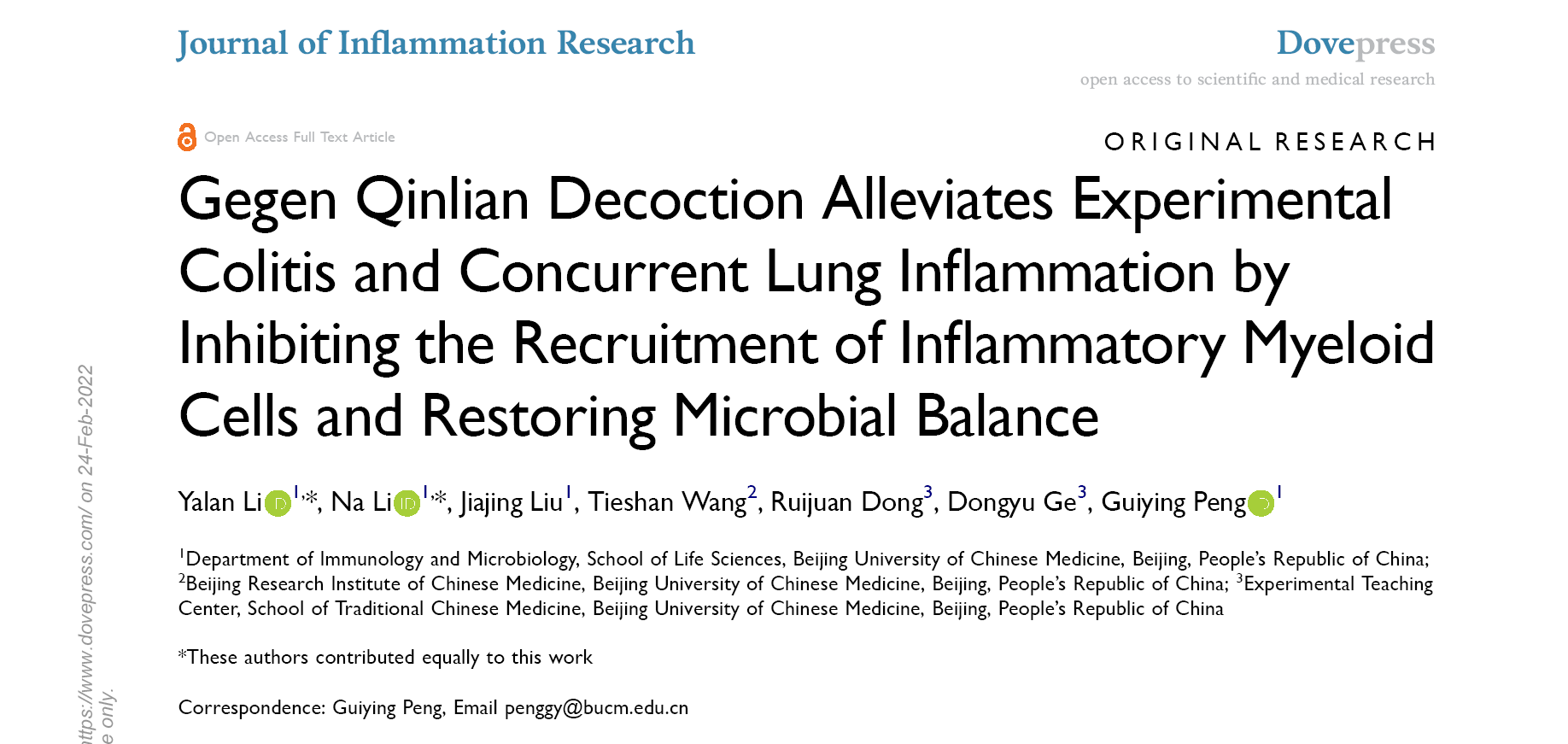 2月24日,我校生命科學學院彭桂英教授在免疫學期刊Journal of Inflammation Research(JCR一區)上以通訊作者發表題為“Gegen Qinlian Decoction alleviates experimental colitis and concurrent lung inflammation by inhibiting the recruitment of inflammatory myeloid cells and restoring microbial balance”的文章,北京中醫藥大學生命科學學院為第一完成單位。生命科學學院2021屆碩士畢業生李亞蘭和講師李娜為論文共同第一作者。該研究基于腸-肺軸首次探究了經方葛根芩連湯調節髓系免疫細胞和微生物群落介導的免疫穩態治療潰瘍性結腸炎及其肺損傷的分子機制,豐富了中醫“肺合大腸”理論的生物學內涵,并對于開發新的治療性生物標志物和防治結腸炎合并肺部并發癥具有重要指導意義。