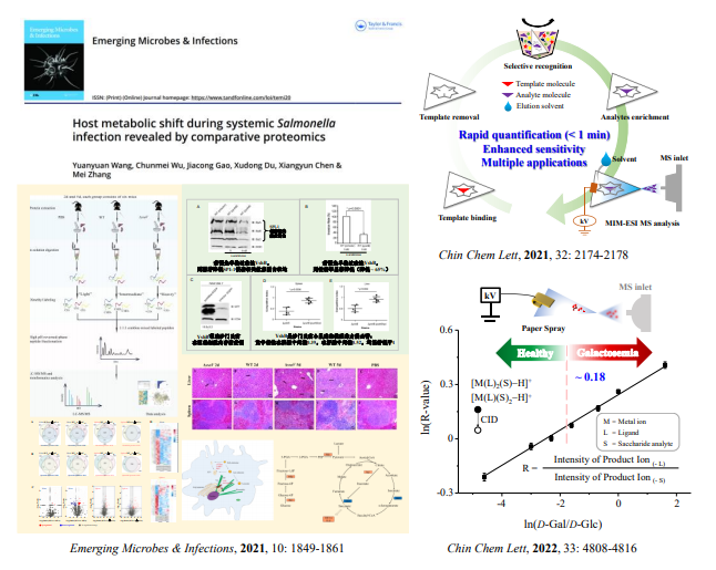 依托該平臺,中藥學院張玫課題組在沙門氏菌系統(tǒng)性感染機制研究方面取得進展,并為后續(xù)開展與中藥學領域交叉研究開發(fā)了適用于腸道復雜體系的中藥快速質(zhì)譜分析技術(詳見下圖),獲得了國家自然科學基金面上項目(No. 82072247)和北京中醫(yī)藥大學科研基金(Nos. 2021-JYB-XJSJJ001、 XJYS21005)的支持。相關成果發(fā)表于 Emerging Microbes & Infections(Q1 區(qū),IF 19.5)和 Chin Chem Lett(Q1 區(qū),IF 8.5)。張玫副教授為通訊作者;北京中醫(yī)藥大學為通訊單位;北京中醫(yī)藥大學與南開大學聯(lián)培博士生王媛媛、張玫課題組碩士生吳春梅、碩士生胡王敏分別為三篇文章的第一作者。