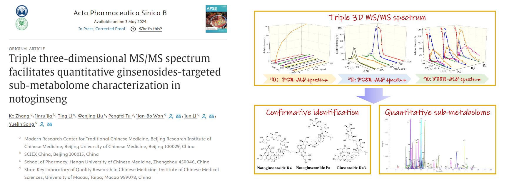 相關研究成果以“Triple three-dimensional MS/MS spectrum facilitates quantitative ginsenosides-targeted sub-metabolome characterization in notoginseng”為題在線發表于中科院一區Top期刊Acta Pharmaceutica Sinica B(https://doi.org/10.1016/j.apsb.2024.04.029)。
