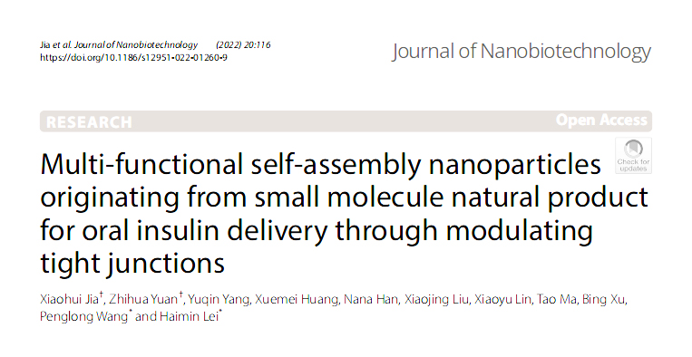 近日,我校中藥學(xué)院雷海民、王鵬龍教授課題組在黃連解毒湯超分子部位作為遞藥載體和降血糖研究方面取得進(jìn)展。相關(guān)研究結(jié)果以“Multi-functional self-assembly nanoparticles originating from small molecule natural product for oral insulin delivery through modulating tight Junctions”為題發(fā)表于中科院二區(qū)雜志Journal of Nanobiotechnology。碩士研究生賈曉慧、袁枝花為論文第一作者,雷海民教授、王鵬龍教授為論文通訊作者。