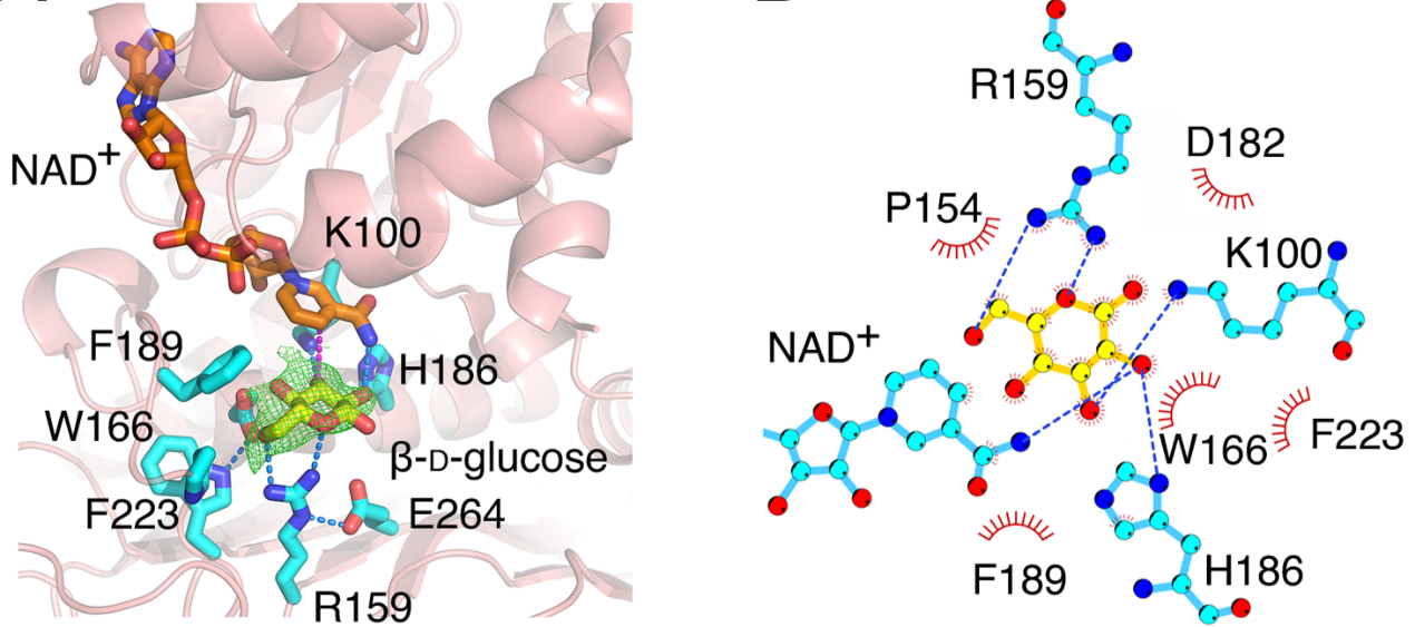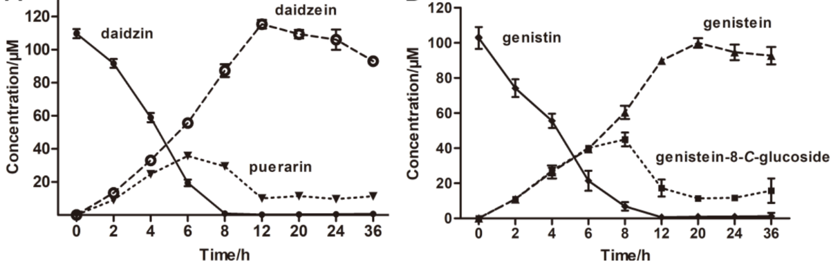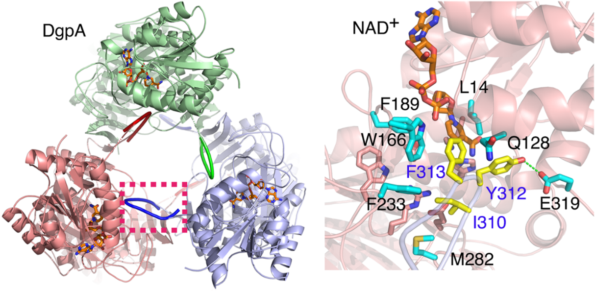 黃酮碳苷類化合物廣泛存在于多種中藥中,是中藥發(fā)揮藥效的重要成分之一。此類成分包括葛根素、葒草素、牡荊素等的糖基以C-C單鍵與苷元連接。由于C-糖苷鍵的特殊穩(wěn)定性,導(dǎo)致碳苷類中藥成分大多難以被代謝。而人源腸道菌PUE分泌的DgpA/B/C蛋白質(zhì)復(fù)合物能夠特異性地切割葛根素的C-糖苷鍵這一過程的分子機理并不明確。我校生命科學(xué)學(xué)院馬文福團隊與王如峰團隊合作首次解析了DgpA與底物結(jié)合的復(fù)合物晶體結(jié)構(gòu),發(fā)現(xiàn)了DgpA/B/C既是一類碳苷類裂解酶,同時也是轉(zhuǎn)化氧苷到碳苷類的異構(gòu)酶。這些發(fā)現(xiàn)不僅揭示了酶介導(dǎo)的C-糖苷鍵斷裂機制,而且可為碳苷類化合物的生物合成研究提供新思路。