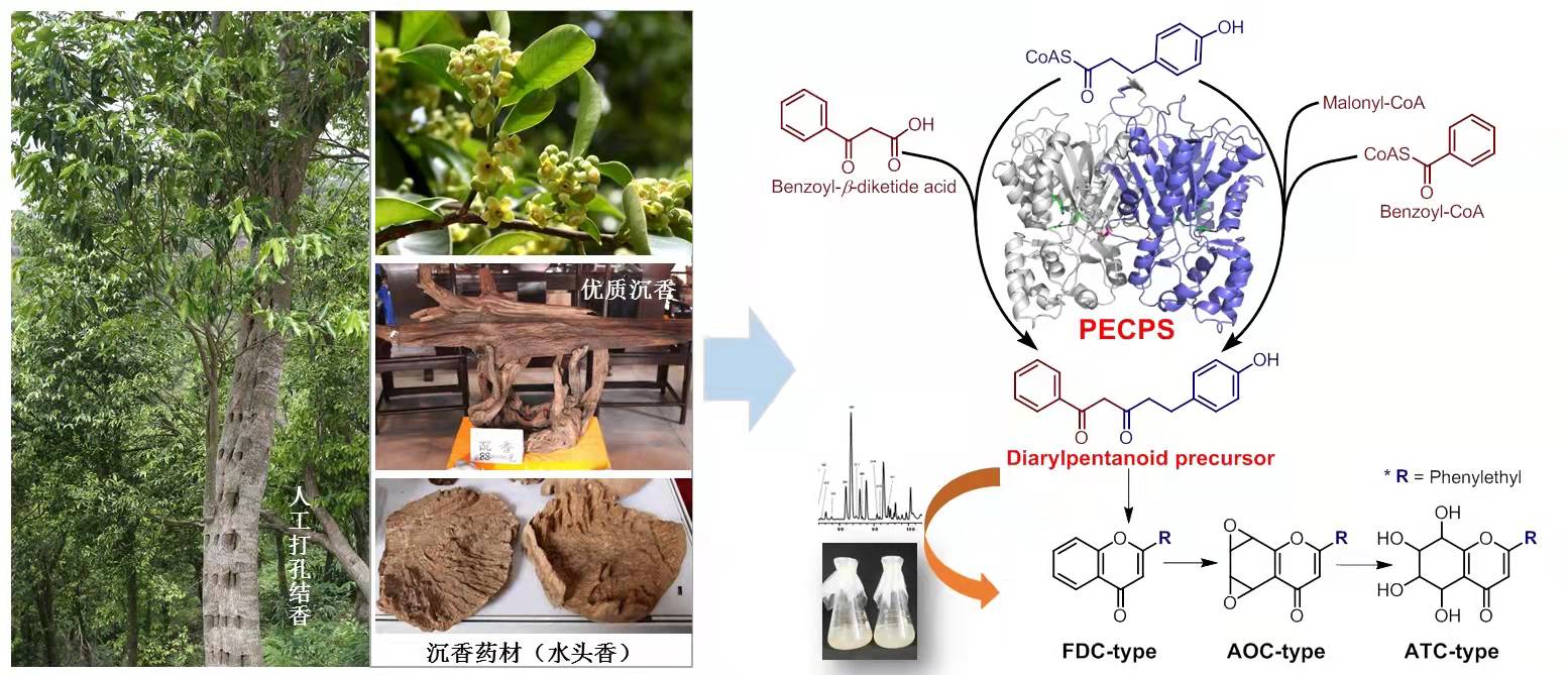 沉香的形成實(shí)質(zhì)上是防御性次生代謝產(chǎn)物苯乙基色酮類和倍半萜類成分在體內(nèi)緩慢合成累積的過程。其中苯乙基色酮類成分是沉香的特有成分,也是其功效和獨(dú)特香味的主要物質(zhì)。我校中藥現(xiàn)代研究中心團(tuán)隊(duì)與日本富山大學(xué)、東京大學(xué)學(xué)者合作,破解了苯乙基色酮的生物合成機(jī)制,構(gòu)建了利用白木香懸浮細(xì)胞快速合成結(jié)構(gòu)多樣的苯乙基色酮的生物合成體系;克隆鑒定了合成苯乙基色酮的關(guān)鍵酶PECPS, 通過將PECPS在本氏煙中瞬時(shí)表達(dá)、在白木香愈傷組織中敲低表達(dá)等實(shí)驗(yàn),證明PECPS的體內(nèi)生物學(xué)功能;制備并解析了PECPS及其4個(gè)關(guān)鍵突變體蛋白的晶體結(jié)構(gòu),闡明了PECPS獨(dú)特的催化機(jī)制。研究結(jié)果突破了利用合成生物學(xué)手段組合合成沉香苯乙基色酮類成分和精準(zhǔn)調(diào)控白木香結(jié)香的關(guān)鍵科學(xué)問題。