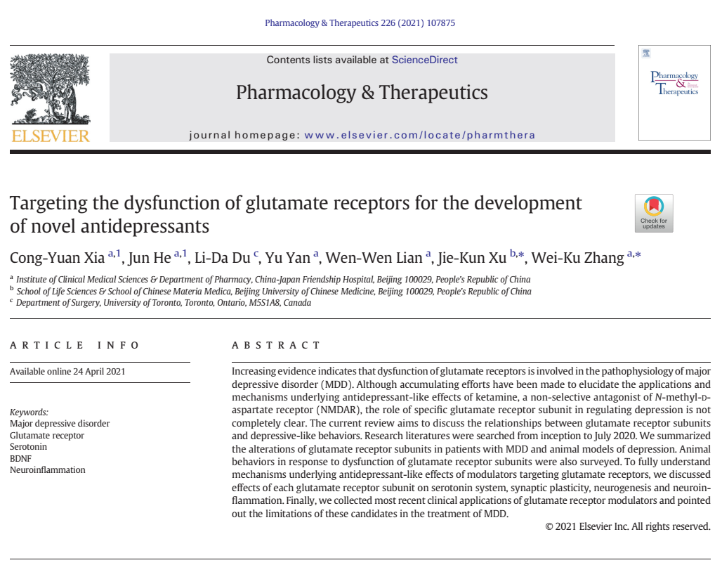 近日,我校生命科學學院續潔琨教授受邀在藥學權威期刊 Pharmacology & Therapeutics(JCR藥學1區)上發表題為“Targeting the dysfunction of glutamate receptors for the development of novel antidepressants”的綜述,該文系統總結了靶向谷氨酸受體的抗抑郁藥物的研究進展,并分析了存在的挑戰。