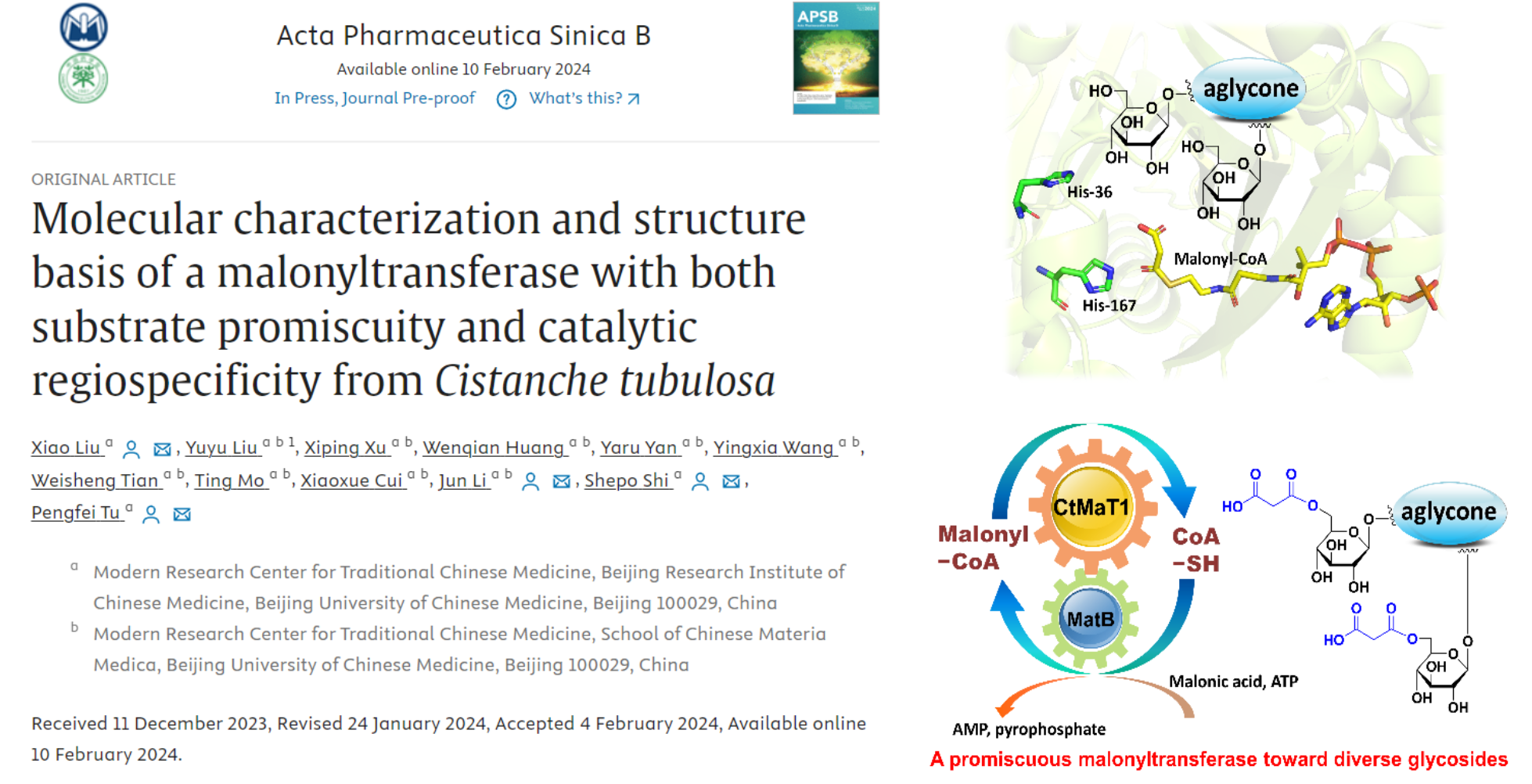 此項研究鑒定了首個兼具底物雜泛性及催化位置特異性的丙二?;D移酶,為藥用活性丙二酰糖苷類化合物的制備提供了新的途徑,也為含丙二酰基取代糖苷類化合物生物合成工程菌的構建提供了基因元件,亦為植物來源丙二?;D移酶結構與功能的研究提供了參考依據。相關研究結果近日以“Molecular characterization and structure basis of a malonyltransferase with both substrate promiscuity and catalytic regiospecificity from Cistanche tubulosa”為題在線發表于藥學領域中科院一區期刊Acta Pharmaceutica Sinica B (DOI:10.1016/j.apsb.2024.02.007)。北京中醫藥大學北京中醫藥研究院副研究員劉曉為該文的第一作者及共同通訊作者,中藥學院2017屆碩士畢業生劉雨雨為論文第二作者,屠鵬飛教授、史社坡研究員、李軍研究員為該文的