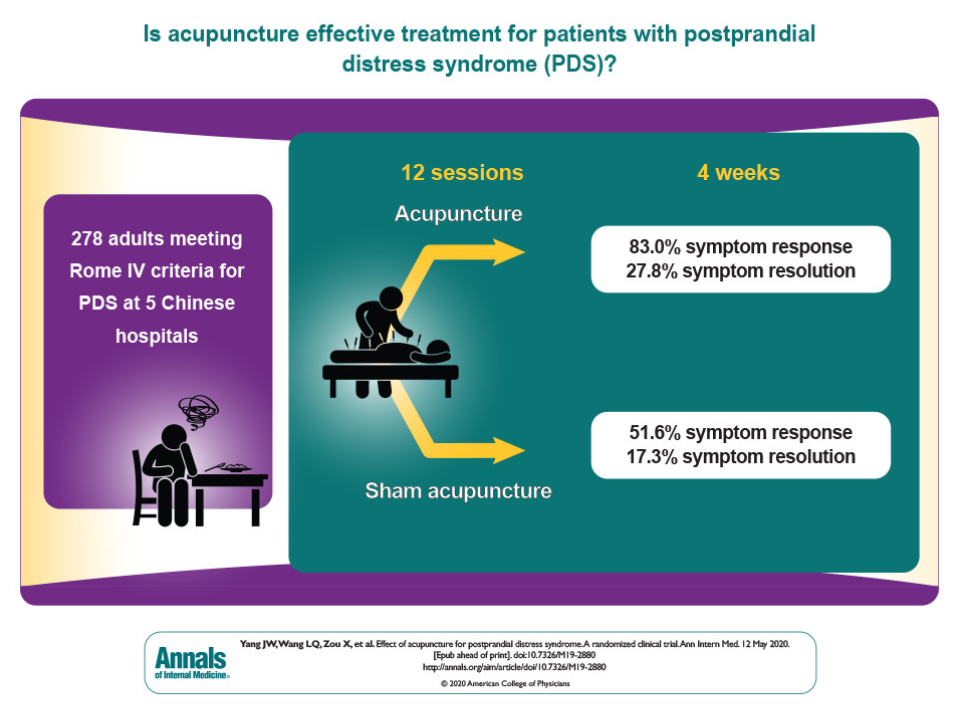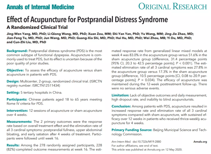5月12日,國際權(quán)威醫(yī)學(xué)期刊《內(nèi)科學(xué)年鑒》(Annals of Internal Medicine)全文在線發(fā)表了由我校針灸推拿學(xué)院劉存志教授團隊牽頭完成的《針刺治療餐后不適綜合征的隨機對照試驗》文章。我校針灸推拿學(xué)院楊靜雯講師為文章第一作者,劉存志教授為通訊作者。