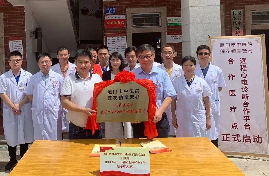 醫院與廈門市同安區蓮花鎮軍營村、同安區蓮花鎮白交祠村簽署黨建共建幫扶協議,搭建新時代文明實踐醫療合作點,將優質醫療服務送上山,打通醫療服務最后一公里。充分利用醫院胸痛中心醫療資源,由黨員捐資購買贈送12導心電圖機及應用軟件,設立遠程心電診斷合作平臺,讓偏遠山區的心血管病人在家門口就能接受優質中醫藥診療。值得強調的是,2019年與軍營村建設的遠程心電診斷合作平臺,是福建省首個三甲醫院與村級衛生室遠程心電會診系統,實現了優質醫療“零距離”。