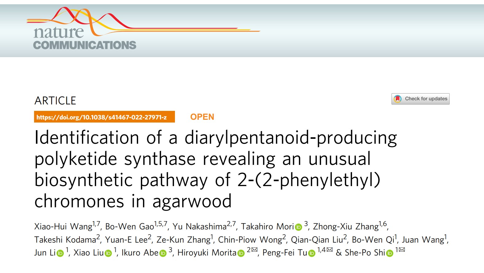 相關研究結果以“Identification of a diarylpentanoid-producing polyketide synthase revealing an unusual biosynthetic pathway of 2-(2-phenylethyl)chromones in agarwood”為題在線發表于自然指數期刊Nature Communications(https://www.nature.com/articles/s41467-022-27971-z)。北京中醫藥大學王曉暉、高博文博士及日本富山大學Yu Nakashima博士為本論文共同第一作者,北京中醫藥大學史社坡、屠鵬飛教授,日本富山大學Hiroyuki Morita教授為論文共同通訊作者。研究工作得到了國家重點研發計劃(2019YFC1711008)和國家自然科學基金面上項目(81773842)等項目的資助。