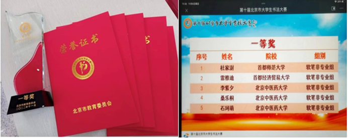 由北京市教委主辦的“翰墨潤古韻,揚帆新征程”第十屆北京市大學生書法大賽決賽成績也于近日揭曉。我校5名入圍決賽同學憑借扎實的書法功底和深厚的文化底蘊獲得三個一等獎,兩個三等獎。