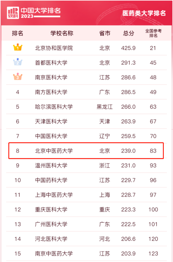 3月30日上午,軟科正式發(fā)布了“2023年軟科中國大學(xué)排名”,排名對象為中國1073所本科層次高校。在2023年軟科中國醫(yī)藥類大學(xué)排名中,共85所高校上榜,北京協(xié)和醫(yī)學(xué)院、首都醫(yī)科大學(xué)和南京醫(yī)科大學(xué)分列前三名,我校位列第8名,繼續(xù)領(lǐng)跑中醫(yī)藥院校。