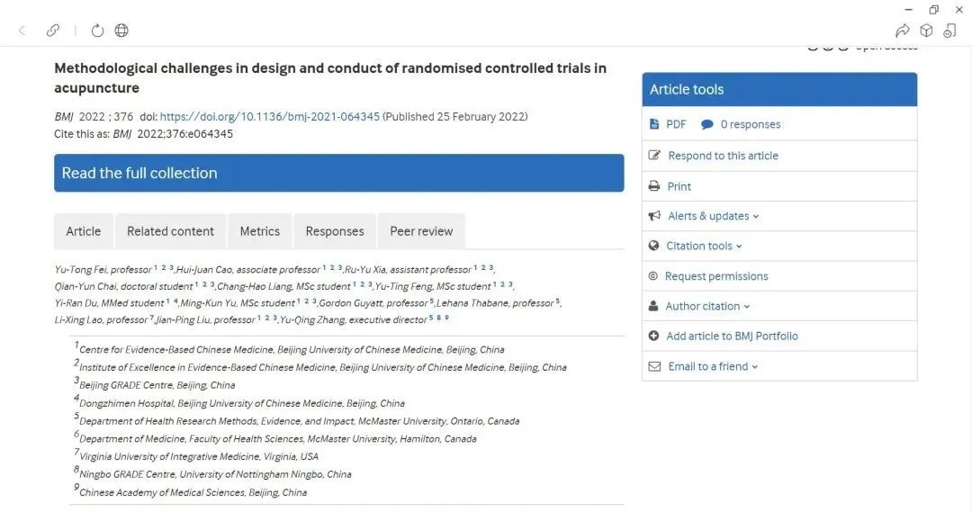 第一篇文章題為《針刺隨機對照試驗設計和實施中的方法學挑戰》(Methodological challenges in design and conduct of randomised controlled trials in acupuncture),由循證醫學中心劉建平教授(通訊作者)和費宇彤研究員(第一作者)領銜,曹卉娟副教授(共同第一作者)、夏如玉博士作為主要作者,帶領柴倩云等研究生共同完成,匯集加拿大麥克馬斯特大學、美國弗吉尼亞中醫藥大學等著名循證醫學專家和針灸專家,在查閱參考了大量國內外針灸臨床研究文獻的基礎上,結合多年來在針灸臨床研究當中的經驗,以及在針灸標準化研究過程當中的挑戰,經過多輪反復論證和共識之后形成。