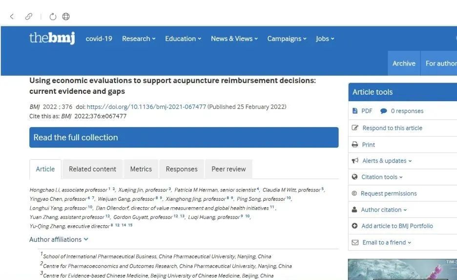 另一篇文章題為《使用衛生經濟學評價支持針灸報銷決策的現有證據和差距》(Using economic evaluations to support acupuncture reimbursement decisions: current evidence and gaps),由中國藥科大學李洪超副教授和北京中醫藥大學循證醫學中心金雪晶教授作為共同第一作者,匯集了來自中國藥科大學、上海復旦大學、中國中醫科學院、加拿大麥克馬斯特大學、瑞士蘇黎世大學、美國塔夫茨醫療中心、RAND公司的相關學者。