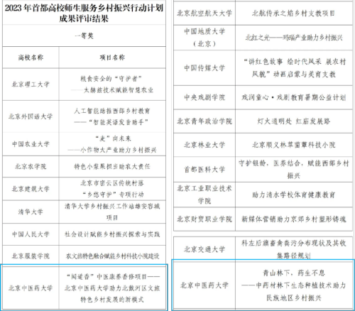 “首都高校師生服務鄉村振興行動計劃”評審旨在教育引導廣大首都高校師生發揮知識優勢、深入鄉村一線,助力鄉村振興,上好首都特色“大思政課”,推動習近平總書記重要回信精神在首都高校形成生動實踐。此次,兩個項目的獲獎展現了北中醫學子腳踏實地、力學篤行的精神面貌,也將激勵更多北中醫青年在強國建設、民族復興中展現青春作為,為推進鄉村振興貢獻青春力量。