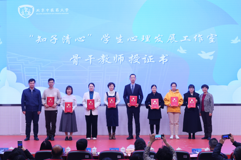 隨后,舉行知子清心學生心理發展工作室特聘專家授牌、骨干成員授證書儀式,并頒發北京中醫藥大學第十九屆心理文化季優秀組織獎。王瑤琪書記、汪慶華副書記及與會領導對我校為學生心理健康和危機干預付出心血與汗水的心理健康教育工作隊伍頒發了證書、進行了表彰。