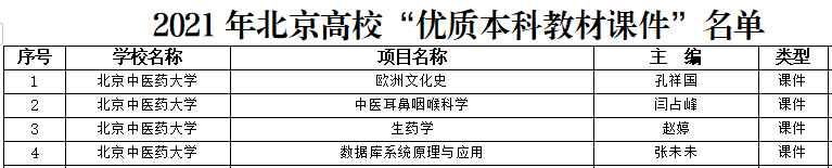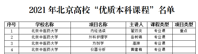 近日,北京市教育委員會發布《北京市教育委員會關于公布2021年“優質本科課程”和“優質本科教材課件”遴選結果的通知》(京教函〔2021〕467號),我校黨委副書記、副校長翟雙慶教授負責的《內經選讀》獲評北京高校“優質本科課程”重點項目,岳樹錦副教授負責的《外科護理學》、高琳教授負責的《方劑學》、黃建梅教授負責的《儀器分析》獲評北京高校“優質本科課程”一般項目。我校推薦課件孔祥國副教授的《歐洲文化史》、閆占峰副主任醫師的《中醫耳鼻咽喉科學》、趙婷講師的《生藥學》、張未未副教授的《數據庫系統原理與應用》獲評北京高校“優質本科教材課件”一般項目。