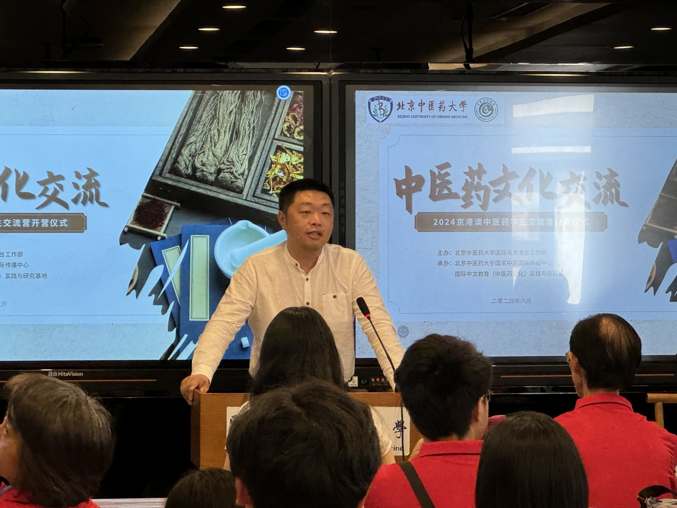6月12日,2024京港澳學生中醫藥文化交流營在我校中醫藥體驗館舉行開營儀式。我校國際與港澳臺工作部副主任李博,國家中醫國際傳播中心副主任王珊珊,來自香港大學、香港中文大學、香港浸會大學、澳門科技大學的44名師生,以及我校中醫國際傳播協會的學生志愿者團隊參加開營儀式。開營儀式由國家中醫國際傳播中心王印螺老師主持。