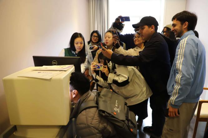 記者們參觀了一層杏林苑各展室,在百草堂品嘗中藥五味、造藥局制作艾條、針推閣感受經絡循行、四診堂體驗現代化中醫舌診儀,功夫閣跟練導引功法,通過我校中醫國際傳播協會學生志愿者的講解,記者們對中醫藥文化有了初步了解。
