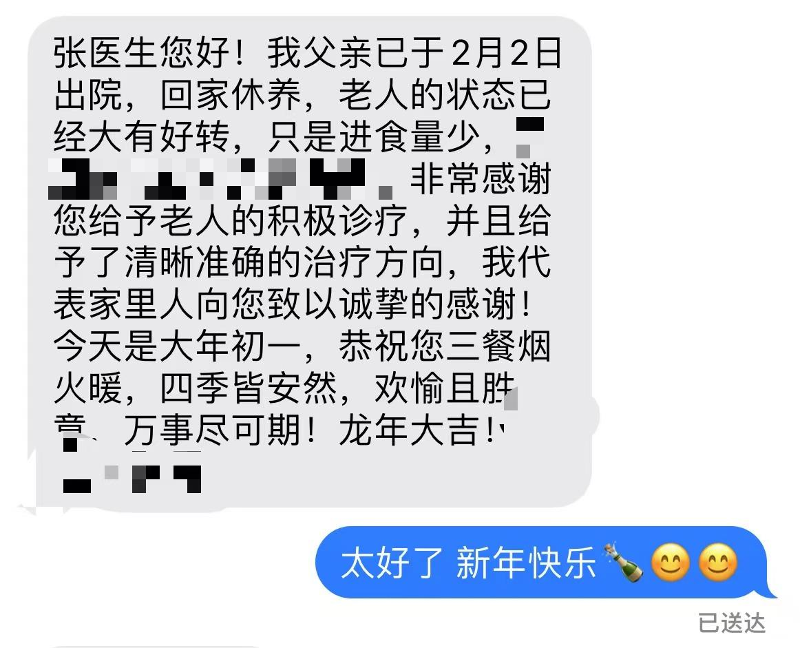 “叮叮”手機震動,屏幕亮起,一條短信打破了春節(jié)的喜慶氛圍,將我拉回到一個月前那緊張的救治時刻。 “張醫(yī)生您好!我父親已于2月2日出院,回家休養(yǎng),老人的狀態(tài)已經(jīng)大有好轉(zhuǎn),只是進食量少……非常感謝您給予老人的積極診療,并且給予了清晰準確的治療方向,我代表家里人向您致以誠摯的感謝!今天是大年初一,恭祝您三餐煙火暖,四季皆安然,歡愉且勝意,萬事盡可期!龍年大吉!”