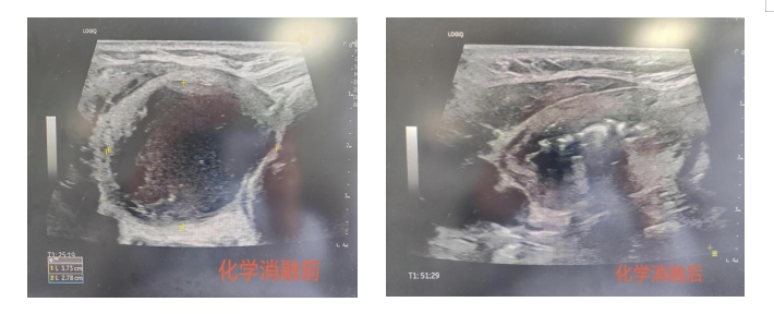 化學消融術案例:首例化學消融術患者為62歲男性,因頸部腫脹、吞咽伴異物感明顯就診,超聲檢查顯示其甲狀腺右葉存在直徑約4cm的囊性為主混合性腫物,已對氣管造成明顯壓迫。傳統手術需切除部分腺體,存在神經損傷及終身服藥風險。經多學科討論,團隊決定采用化學消融術:在超聲引導下,將硬化劑精準注入囊腔,通過化學作用使囊壁內皮細胞失活,促進囊液吸收。術后24小時,患者壓迫癥狀顯著緩解,復查顯示囊腔體積縮小60%以上。