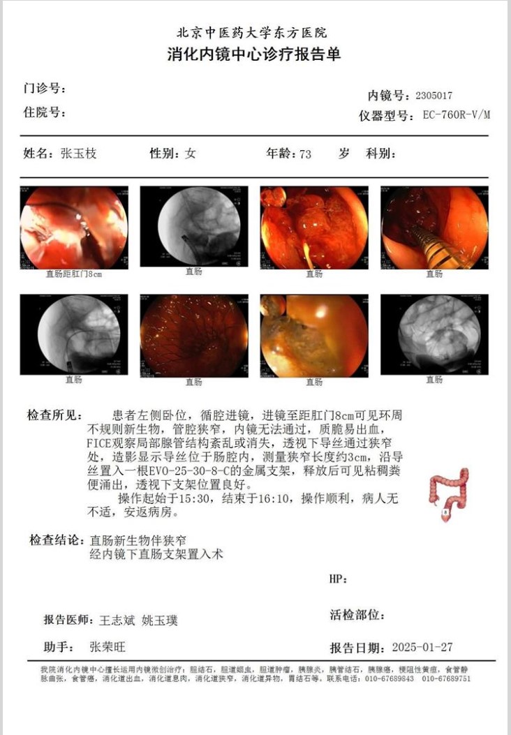北京中醫(yī)藥大學(xué)東方醫(yī)院二七院區(qū)脾胃肝膽科王志斌主任仔細閱片后,高度懷疑患者患有直腸癌。當(dāng)時,患者腸腔張力極高,被難以忍受的腹脹痛折磨,還伴隨著劇烈的惡心嘔吐,情況十分危急。王主任當(dāng)機立斷,決定馬上為患者實施腸道支架置入術(shù),以此解除梗阻,緩解腸道壓力。