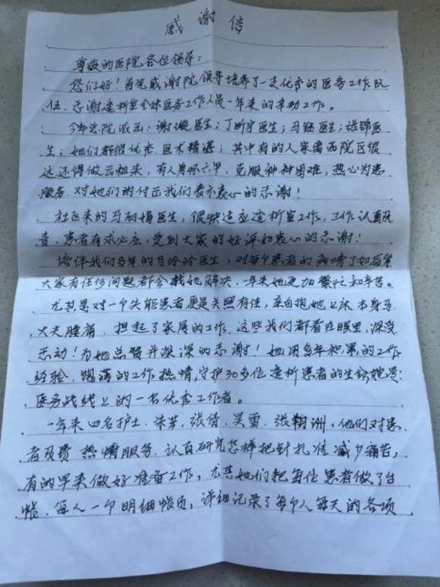 “他們都很優秀,他們醫術精湛,他們熱心為患者服務,他們守護透析患者的生命……”一封寫滿了感謝與贊揚的信,如冬日暖陽般照進了北京中醫藥大學東方醫院二七院區,這是來自30余位透析患者的心聲,字字句句都透露著深深的敬意與感激。在這歲末年初的寒冷時節,這封信如同一股暖流,溫暖了透析室所有工作人員的心房。
