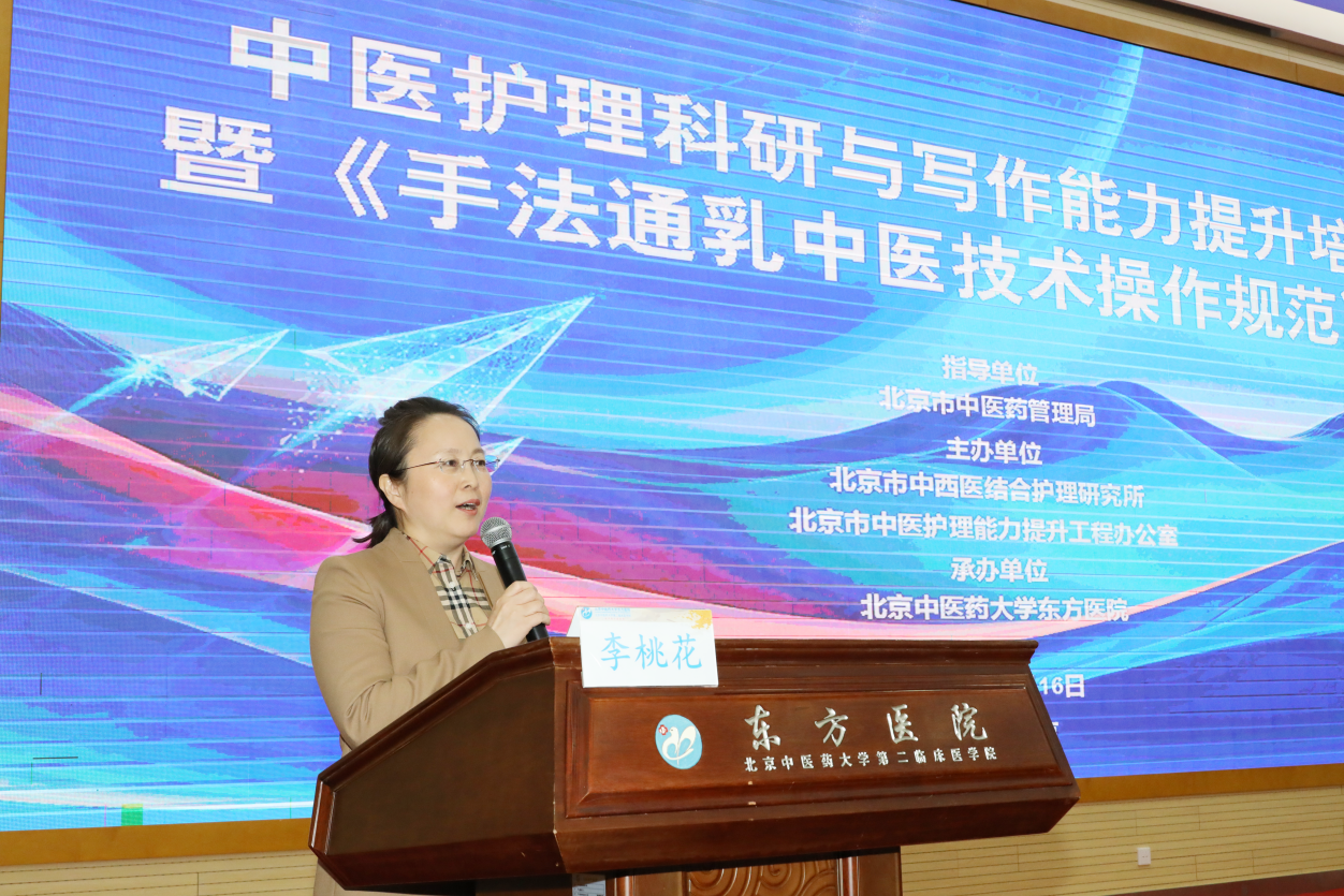 近日,北京中醫藥大學東方醫院舉辦了中醫護理科研與寫作能力提升培訓會暨《手法通乳中醫技術操作規范》推廣會。此次會議由北京市中醫藥管理局指導,北京市中西醫結合護理研究所、北京市中醫護理能力提升工程辦公室主辦。北京市中醫藥管理局醫政處調研員祝靜、中華中醫藥學會標準化辦公室主任蘇祥飛、北京中醫藥大學東方醫院副院長馬建嶺、護理部主任唐玲、科研處副處長馬濤以及來自全國各省市線上線下1.18萬人次護理同仁參加本次會議。北京中醫藥大學東方醫院外二乳腺科主任李桃花主持開幕式。