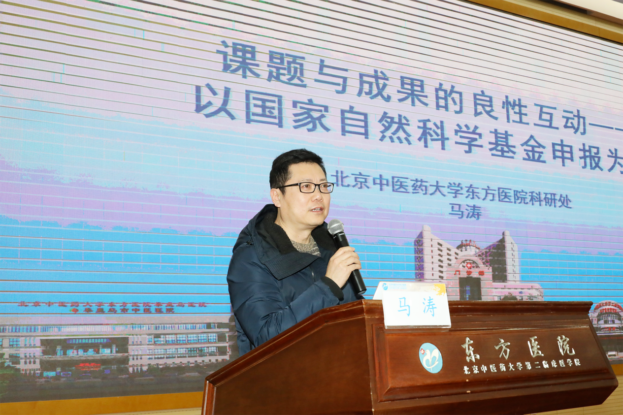 北京中醫藥大學東方醫院科研處副處長馬濤以“課題與成果的良性互動—以國家自然科學基金申報為例”為題進行講座,他用多個通俗易懂的實例詳細闡述了在科研項目申報過程中最容易被忽略的關鍵點,評審專家在項目評審過程中最重視的內容以及如何讓科研項目成為個人職業成長過程中的有效助推力。并將科研項目與個人職業成長結合,從全新的視角解讀科研項目申請、評審、實施等過程關鍵環節。