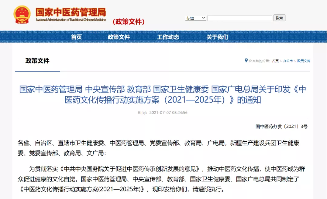 近日,國(guó)家中醫(yī)藥管理局、中央宣傳部、教育部、國(guó)家衛(wèi)生健康委、國(guó)家廣電總局五部門聯(lián)合印發(fā)《中醫(yī)藥文化傳播行動(dòng)實(shí)施方案(2021—2025年)》(以下簡(jiǎn)稱“方案”),部署推動(dòng)“十四五”時(shí)期中醫(yī)藥文化傳承弘揚(yáng)工作,深入挖掘中醫(yī)藥文化精髓、推動(dòng)中醫(yī)藥融入生產(chǎn)生活。《方案》指出,開展中醫(yī)藥文化傳播行動(dòng)是貫徹落實(shí)《中共中央國(guó)務(wù)院關(guān)于促進(jìn)中醫(yī)藥傳承創(chuàng)新發(fā)展的意見》,推動(dòng)中醫(yī)藥文化傳播,使中醫(yī)藥成為群眾促進(jìn)健康的文化自覺的重要舉措。
