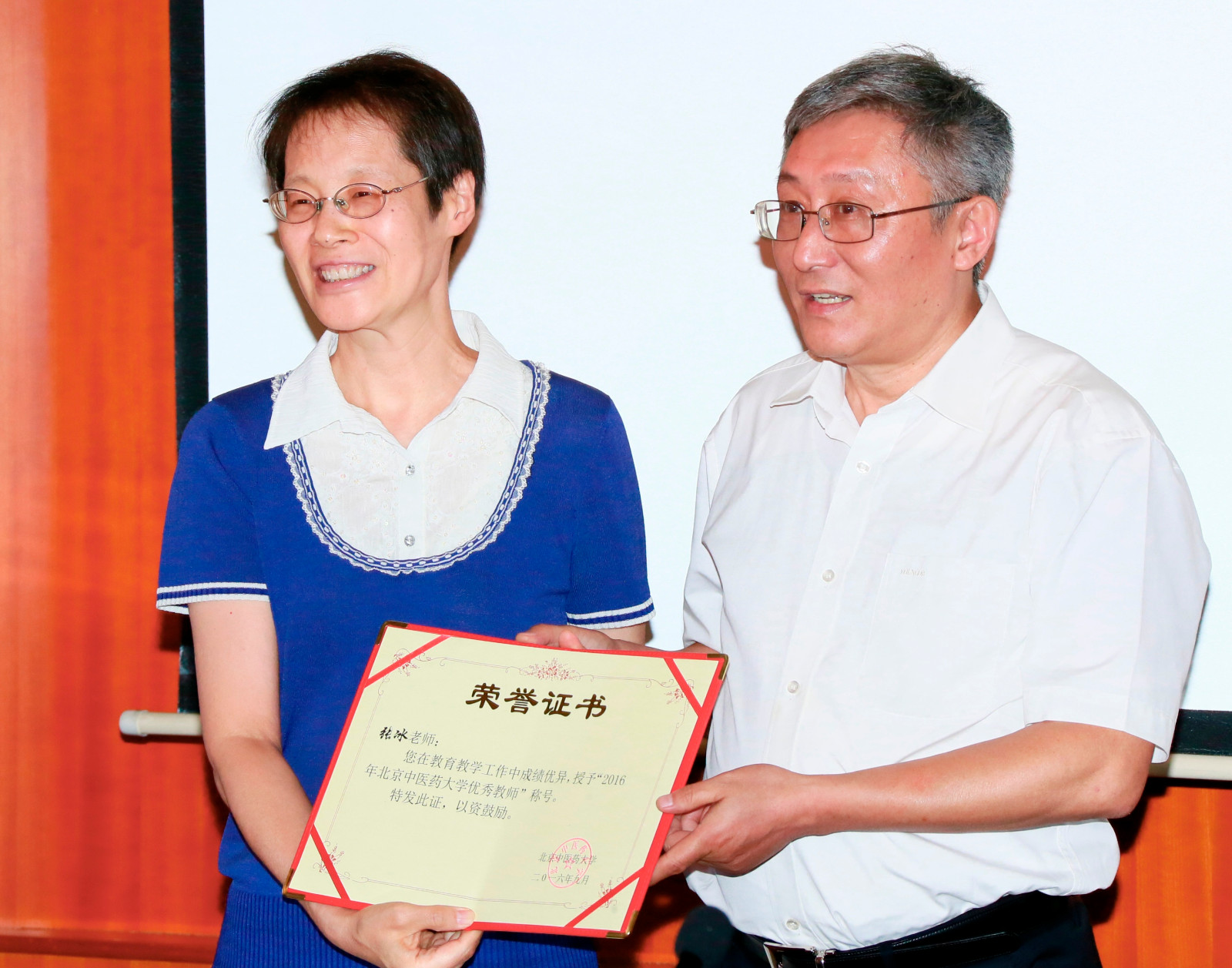 座談會在熱烈祥和的氣氛中舉行。谷曉紅副校長首先宣讀了2016年教師節表彰名單,其中包括2016年北京市教學名師1人、2015-2016年北京市優秀輔導員2人、2016年校級教學名師5人、2016年校級優秀教師20人、2016年全國高等中醫藥院校教學基本功比賽獲獎者4人、2015年校級優秀輔導員10人。隨后,吳建偉書記為所有受表彰的教師頒發了榮譽證書并合影留念。