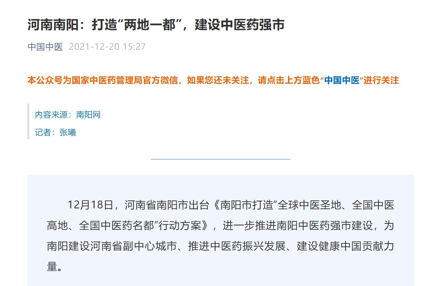 12月18日,《南陽市打造“兩地一都”行動方案》正式印發,并得到了國家中醫藥管理局官方微信報道。該《方案》的實施將對推進醫圣故里中醫藥高質量發展、推進中醫藥振興發展、建設健康中國貢獻力量!