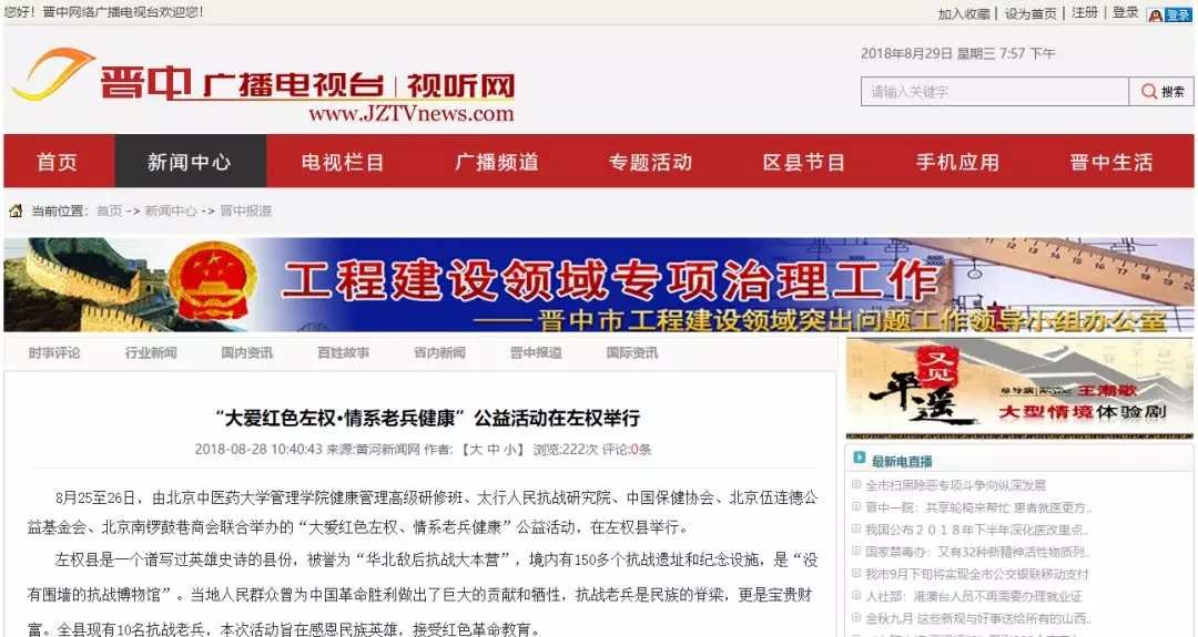 8月25日至26日,受中華英烈褒揚(yáng)事業(yè)促進(jìn)會(huì)委托,由北京中醫(yī)藥大學(xué)管理學(xué)院健康管理高級(jí)研修班,與英促會(huì)抗戰(zhàn)英烈褒揚(yáng)教育基金、太行人民抗戰(zhàn)研究院、北京伍連德基金會(huì)、中國(guó)保健協(xié)會(huì)健康服務(wù)專業(yè)委員會(huì)、北京南鑼鼓巷商會(huì)黨委等多家單位聯(lián)合舉辦的“抗戰(zhàn)老兵健康幫扶紅色左權(quán)行”公益活動(dòng),在山西省左權(quán)縣舉行,旨在為中國(guó)抗戰(zhàn)老兵提供點(diǎn)對(duì)點(diǎn)的健康幫扶、救助等服務(wù)。此次公益活動(dòng)受到左權(quán)縣人民政府的高度重視,分別在“今日中國(guó)”、“左權(quán)縣人民政府官網(wǎng)”等新聞網(wǎng)站上進(jìn)行了相應(yīng)報(bào)道。