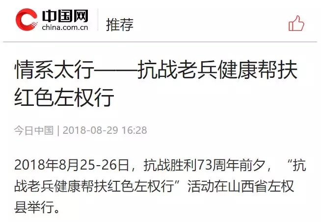 據(jù)“紅色左權(quán)行”活動(dòng)承辦方之一、太行人民抗戰(zhàn)研究院副院長(zhǎng)皇甫建偉介紹,左權(quán)縣是當(dāng)時(shí)華北敵后抗日的重要指揮中心??谷諔?zhàn)爭(zhēng)期間,八路軍總部、中共中央北方局等150多個(gè)黨政軍學(xué)商機(jī)關(guān)團(tuán)體曾在左駐扎五年之久。期間,左權(quán)縣人民毀家紓難、無(wú)私奉獻(xiàn),為民族獨(dú)立和解放事業(yè)做出了巨大貢獻(xiàn)與犧牲。解放后一大批參加過(guò)抗戰(zhàn)的左權(quán)籍老兵解甲歸田,回到家鄉(xiāng)居住、生活。如今他們中的大部分已悄然離世,全縣僅余的9名抗戰(zhàn)老兵(8人為傷殘軍人)也已風(fēng)燭殘年,身體狀況堪憂。這批最后的抗戰(zhàn)老兵中最大的已96歲,最小的也有90歲了。他們有的有子女照顧,有的則無(wú)兒無(wú)女,或散居農(nóng)村,或住在縣里的光榮院里,孤獨(dú)終老。