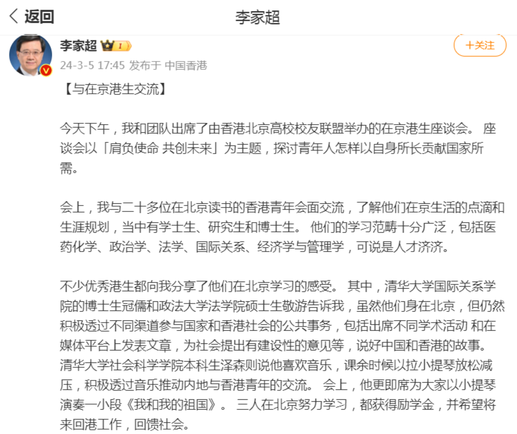 3月5日下午,我校3名中國香港籍學生(本科生2名、研究生1名)參加了由香港北京高校校友聯盟主辦的2024年在京港生座談會。香港特別行政區行政長官李家超、北京市委常委、統戰部部長楊晉柏,北京市政協黨組副書記、副主席崔述強,以及京港兩地有關部門領導出席,和來自11所高校不同專業的24位在京香港青年座談交流,了解他們的學習和生活情況,我校3位港生參加座談。