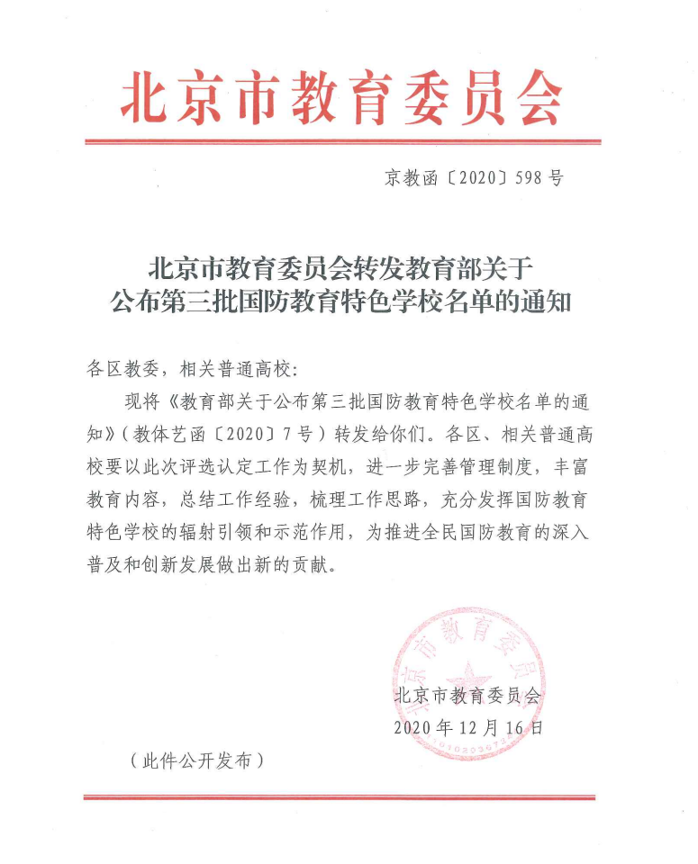 近日,教育部公布第三批國防教育特色學校名單,我校成功入選,成為十所獲此殊榮的北京高校之一。