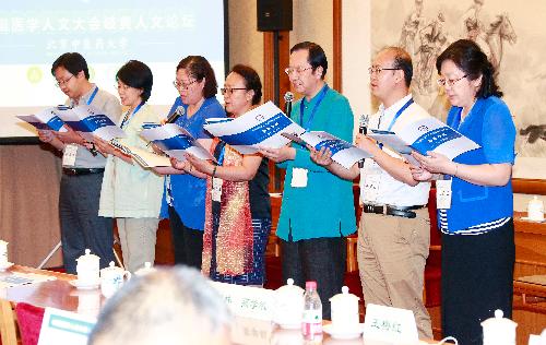 隨后,由我校師生代表論壇向全國醫務工作者發出了《傳承國醫精華踐行人文精神》的倡議,與會者齊聲朗誦,紛紛表示將認真踐行人文精神,傳承國醫精粹,更好的為人民服務。