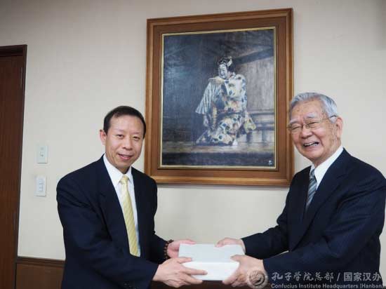 會后,李春生參贊一行還參觀了中醫(yī)藥孔子學院活動中心、事務局辦公室等場所,并觀賞了藏書,聆聽了工作人員對生藥、針灸用具等展品的講解。最后,新家荘平理事長向李參贊贈送了一副親手繪制的日本傳統(tǒng)能劇臨摹畫。