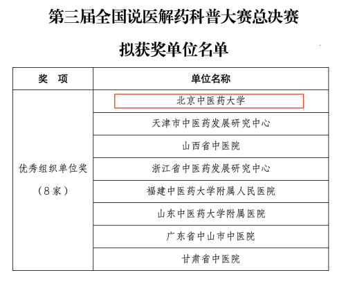 近日,由北京中醫(yī)藥大學(xué)校團(tuán)委承辦的第三屆全國說醫(yī)解藥科普大賽北京賽區(qū)活動圓滿落幕。憑借出色的組織工作與卓越貢獻(xiàn),北京中醫(yī)藥大學(xué)被大賽組委會授予“優(yōu)秀組織單位獎”,充分展現(xiàn)了學(xué)校在中醫(yī)藥文化傳播與科普創(chuàng)新領(lǐng)域的引領(lǐng)作用。
