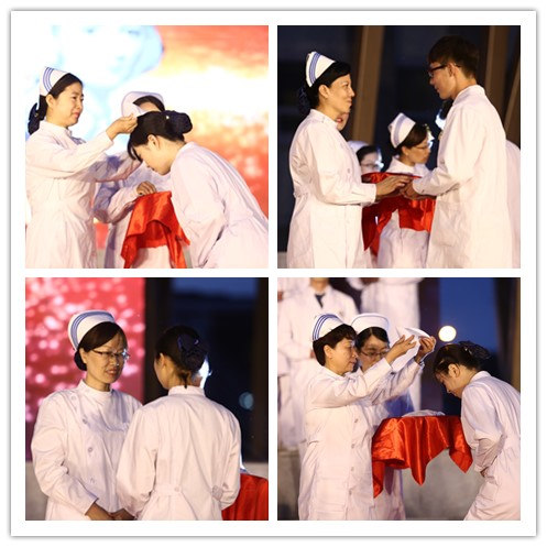 莊嚴而隆重的授帽儀式拉開帷幕,護理學院院長郝玉芳、第一臨床醫學院護理部郭海玲主任、第二臨床醫學院護理部焦蘊蘭主任、第三臨床醫學院護理部唐玲主任、北京中醫醫院護理部郝麗主任、望京醫院護理部曹艷霞主任以及眼科醫院護理部黃少蘭主任為2014級本科班、對外交流班、2015級高職班的42名優秀學生代表授帽,西苑醫院護理部李靜主任帶領同學們進行宣誓,學生們在燭光和誓言中接受了職業精神的洗禮。