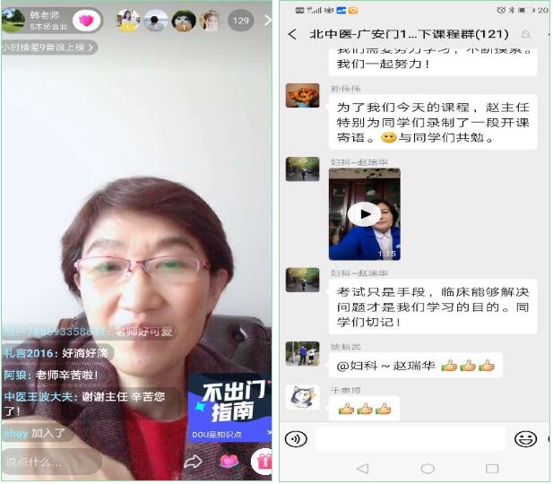 廣安門臨床醫學院西醫內科學、中醫兒科學、中醫婦科學和西醫外科學四個教研室積極準備,通過網絡直播課的新形式為針灸推拿學院2016級卓越針推班同學們進行“傳道授業”。各教研室主任與課程組長在群里不時協助解答同學們提出的相關問題,師生們在課程群里互動熱烈,高質量完成了“開學第一課”。中醫兒科學課程教研室創新教學形式,采用抖音短視頻平臺形式線上直播課程,同學們反饋積極,表示跟課堂授課一樣生動。