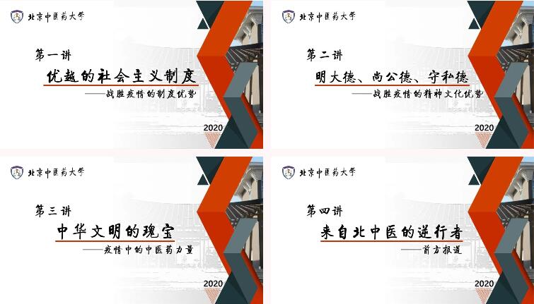 課程共五部分。導論部分為校黨委書記谷曉紅講授的《攜手戰疫,共克時艱》、校長徐安龍講授的《中國抗疫簡史》;第一講《優越的社會主義制度》主要講述社會主義制度是我們戰勝疫情的突出制度優勢;第二講《明大德、尚公德、守私德》主要講述社會主義核心價值觀、醫學職業道德和中醫醫德、社會公德和個人私德是我們戰勝疫情的突出精神優勢;第三講《中華文明的瑰寶》主要講述中醫藥是我們的醫學特色、中西醫結合抗疫是我國特有的醫學優勢,切實增強同學們的專業自信和文化自信;第四講《來自北中醫的逆行者》以直播連線的方式邀請我校支援武漢一線醫護人員以及志愿投身抗疫一線的北中醫學子,現場講述北中醫人在戰“疫”斗爭中的鮮活經歷。