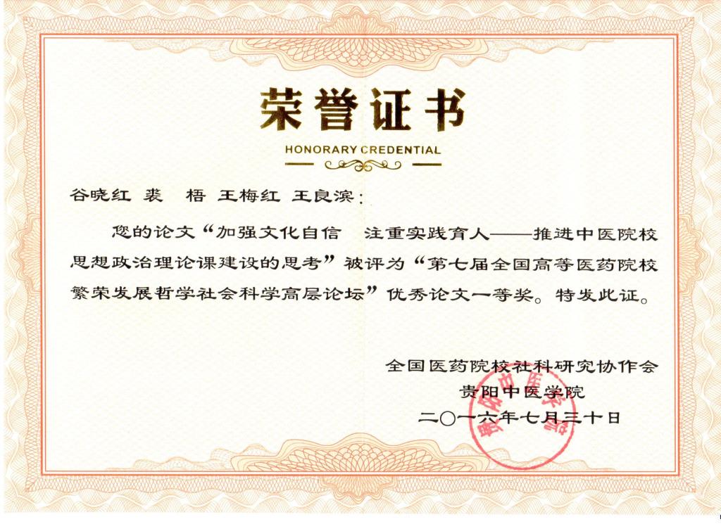 由谷曉紅、裘梧、王梅紅、王良濱撰寫并向大會提交的《加強文化自信注重實踐育人——推進中醫院校思想政治理論課建設的思考》論文,獲評本次論壇優秀論文一等獎。受谷曉紅副校長委托,王梅紅院長代表我校做了題為《加強文化自信注重實踐育人——推進中醫院校思想政治理論課建設的思考》的大會發言,向大會展示了近年來北京中醫藥大學開展思想政治理論課建設的成就、經驗與思考。