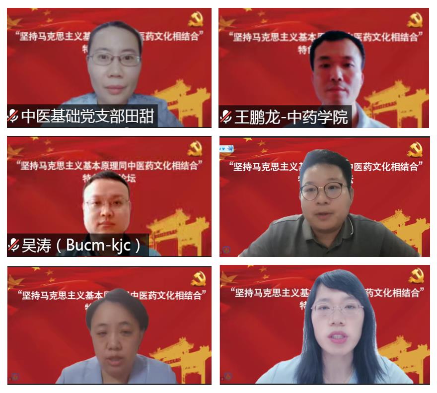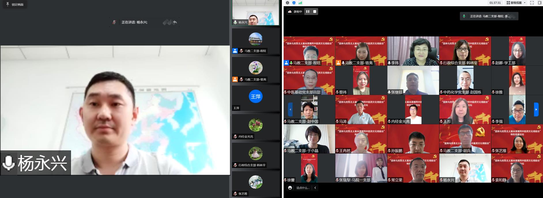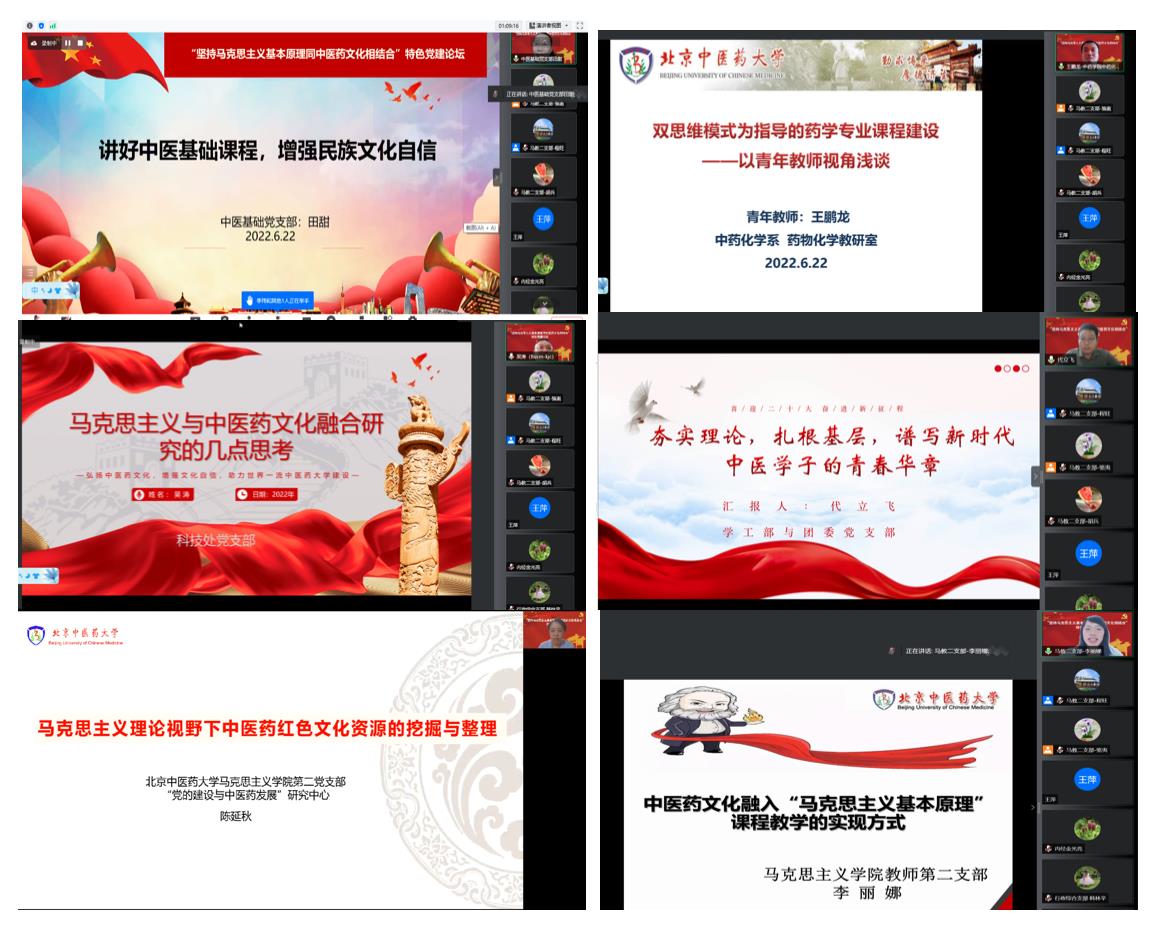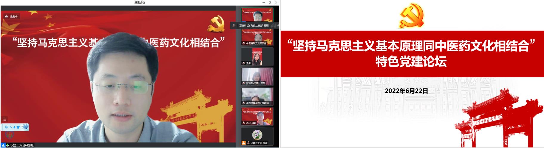 6月22日,在我校馬克思主義學院黨委指導下,馬克思主義學院教師第二黨支部策劃并聯合中醫學院中醫基礎黨支部、中藥學院中藥化學黨支部、科技處黨支部等八個支部共同舉辦了“堅持馬克思主義基本原理同中醫藥文化相結合”特色黨建論壇。校黨委書記谷曉紅、校黨委副書記張繼旺、副校長王耀獻、黨委組織部副部長楊永興出席論壇,馬克思主義學院領導班子成員、主辦支部全體黨員同志等近百人參加特色黨建論壇。