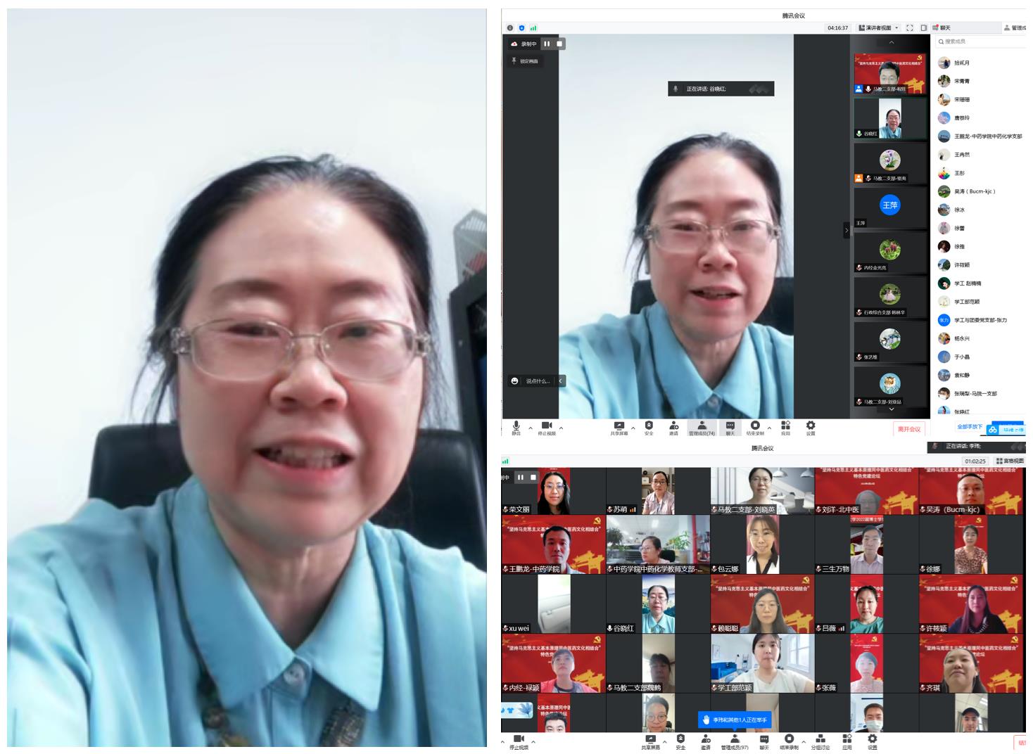 馬克思主義學院教師第一黨支部黨員代表陳延秋以《馬克思主義理論視野下中醫藥紅色文化資源的挖掘與整理》為題做了相關探索,中醫藥紅色文化資源包含豐富的史料內容,在增強文化自信、促進中醫藥文化、傳承紅色基因等方面為“相結合”提供載體,具有重要意義。