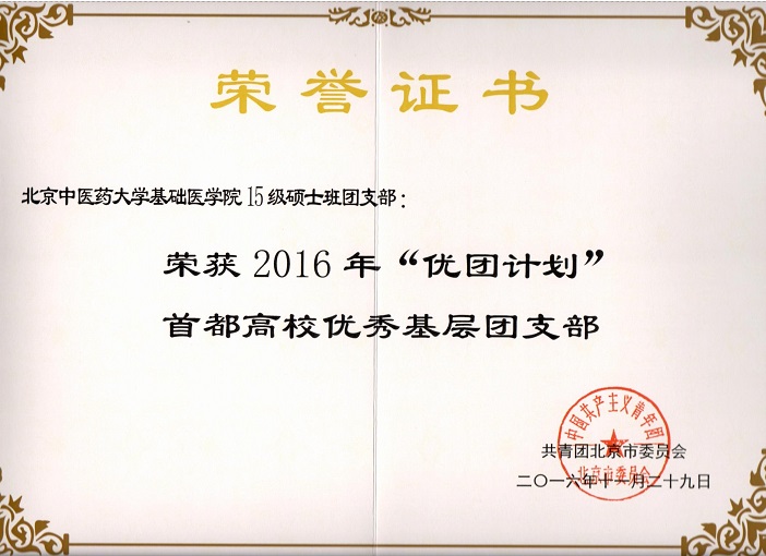 為貫徹中央黨的群團工作會議精神,圍繞全團“凝聚青年、服務大局、當好橋梁、團要管團”四維工作格局,共青團北京市委員會在首都高校中開展基層團支部“優團計劃”優秀基層團支部評選活動。我校中醫學院2015級碩士團支部榮獲2016年“優團計劃”首都高校優秀基層團支部榮譽稱號。