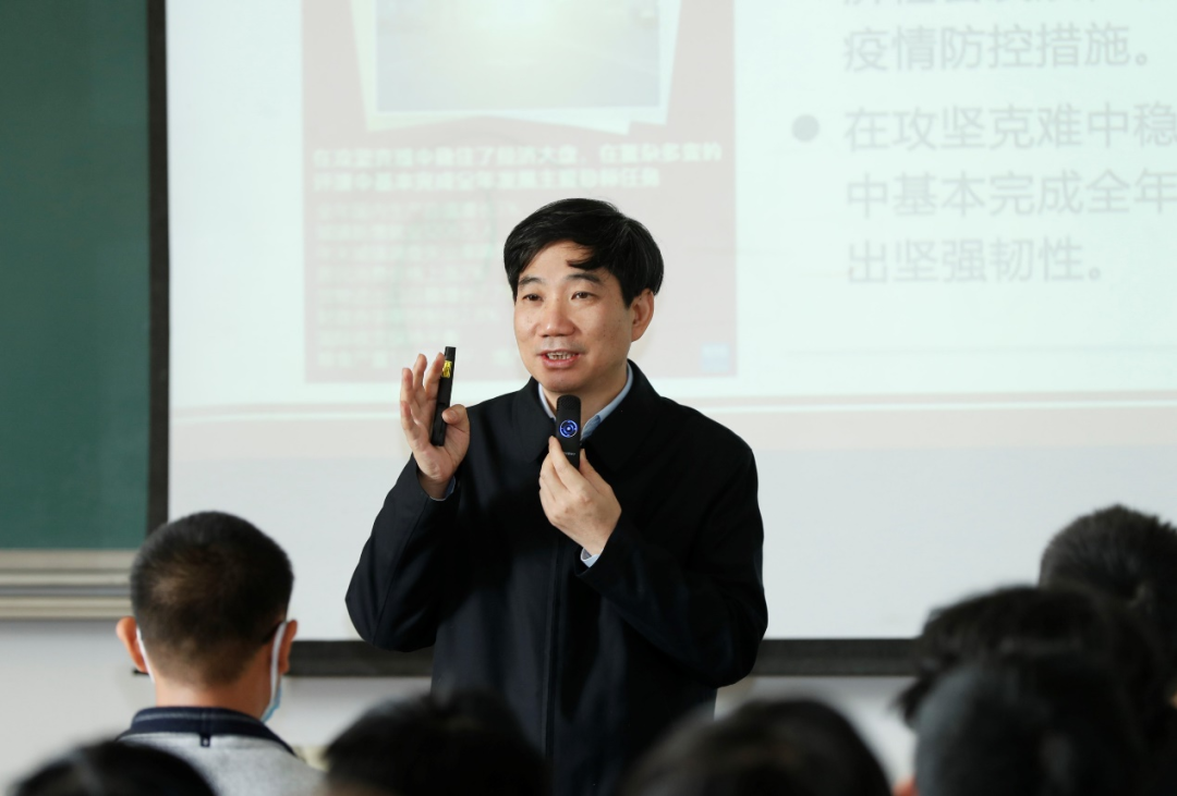 徐安龍校長從“科學把握理想與現實的辯證統一”談起,以北中醫的抗疫歷程、中國共產黨的百年發展歷程為例,并結合自身求學經歷,向同學們講述了要辯證看待理想與現實的矛盾,要正確認識實現理想的長期性、艱巨性和曲折性。他提到,艱苦奮斗是從現實此岸通向理想彼岸的橋梁,要在精神層面保持戰勝一切艱難險阻、一往無前的精神狀態。當代中國既面臨著重要發展機遇,也面臨著前所未有的困難和挑戰,他勉勵廣大青年學子要發揚艱苦奮斗精神,在學習中刻苦鉆研、不畏艱難,在工作中不避艱險、奮發圖強,在生活中勤儉節約、反對鋪張,鍥而不舍、馳而不息地進行奮斗。