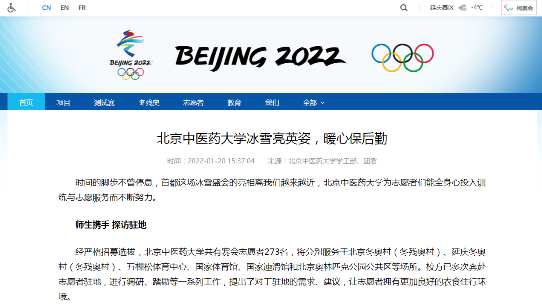 學校還依托學生組織設計并制作了有北中醫(yī)特色的防寒羽絨服、衛(wèi)衣、手套、防疫香囊、預防中藥等物品,讓志愿者暖心、家人放心。近日,北京冬奧會和冬殘奧會官方網站對我校服務保障志愿者工作進行了專題報道。